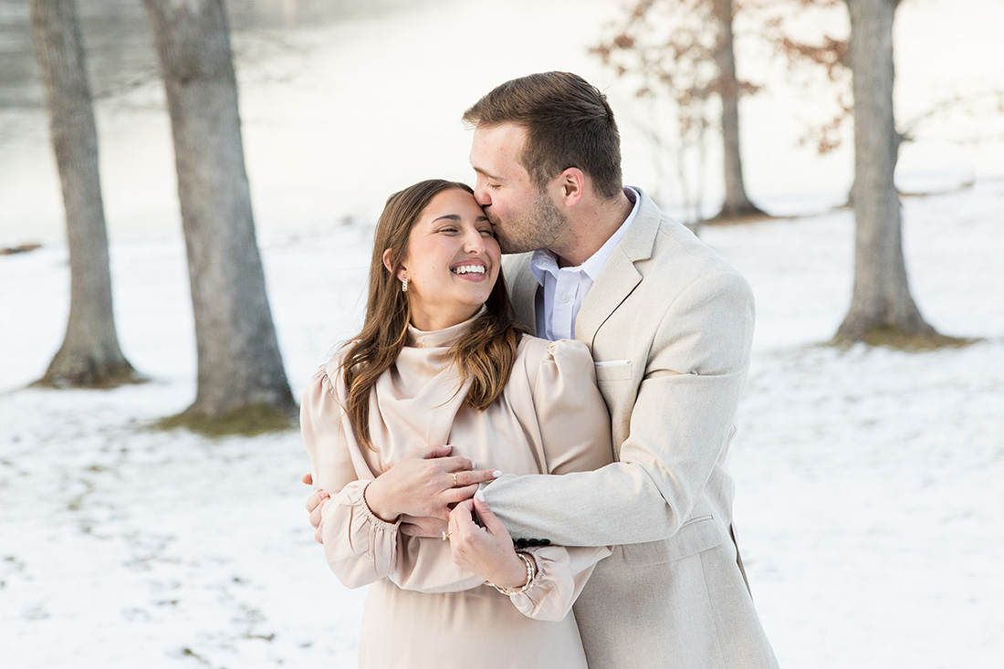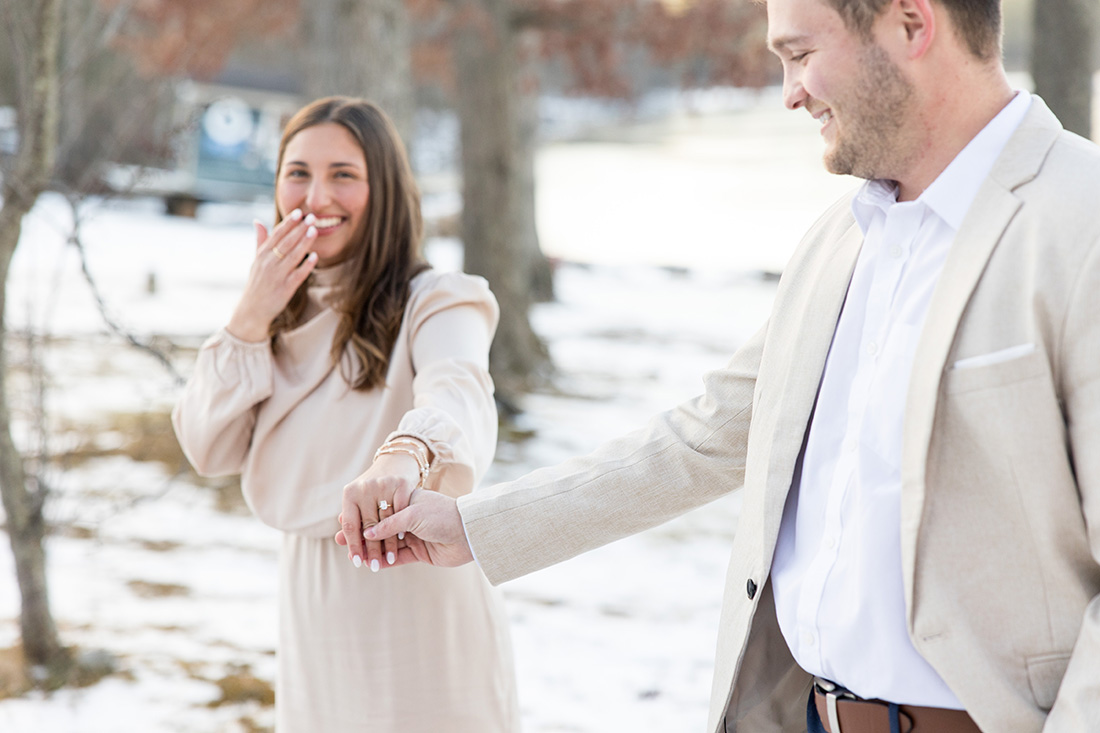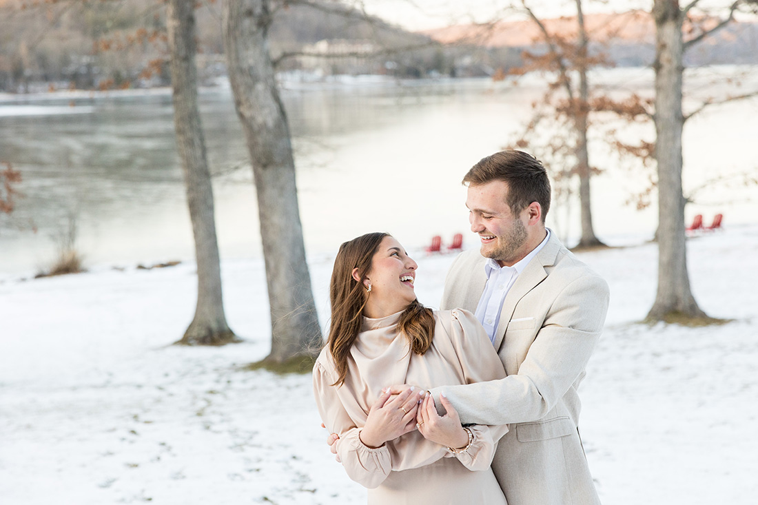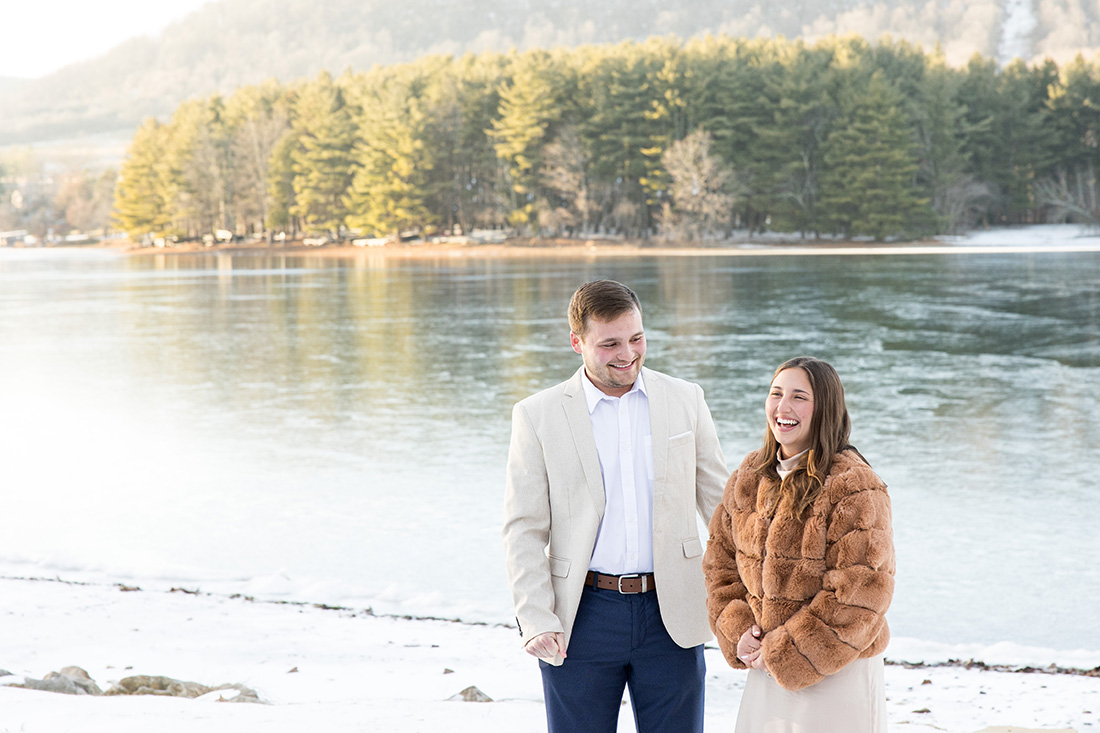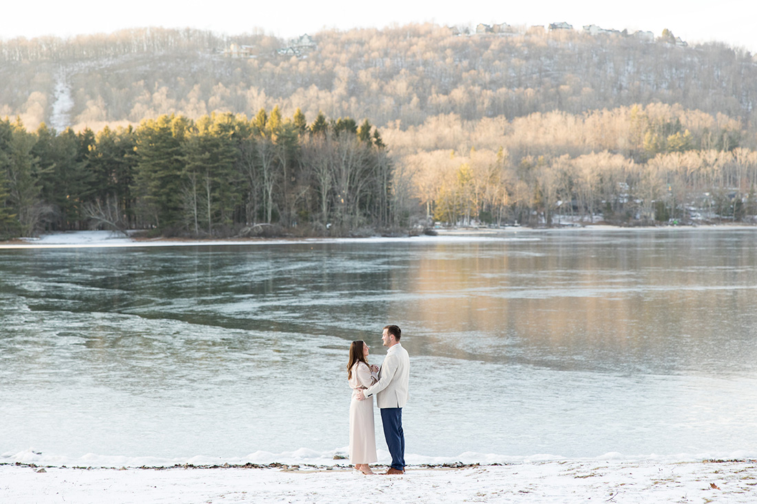 So much of what I remember from this proposal day involves the frosty conditions at the shoreline of Dutch’s at Silver Tree at Deep Creek Lake. The frozen lake, the frosted trees, a touch of snow on the ground, and the softest sunlight pouring across it all. The soft colors were just magnificent – golds and grays and blues and greens…