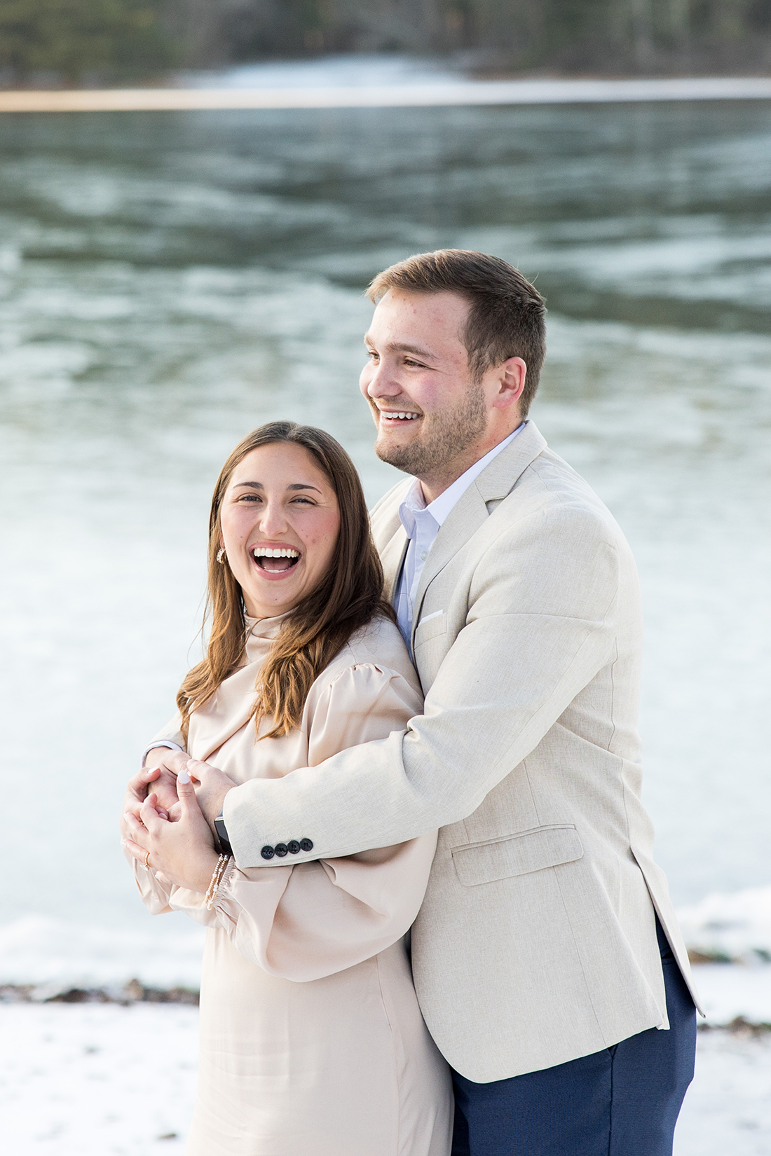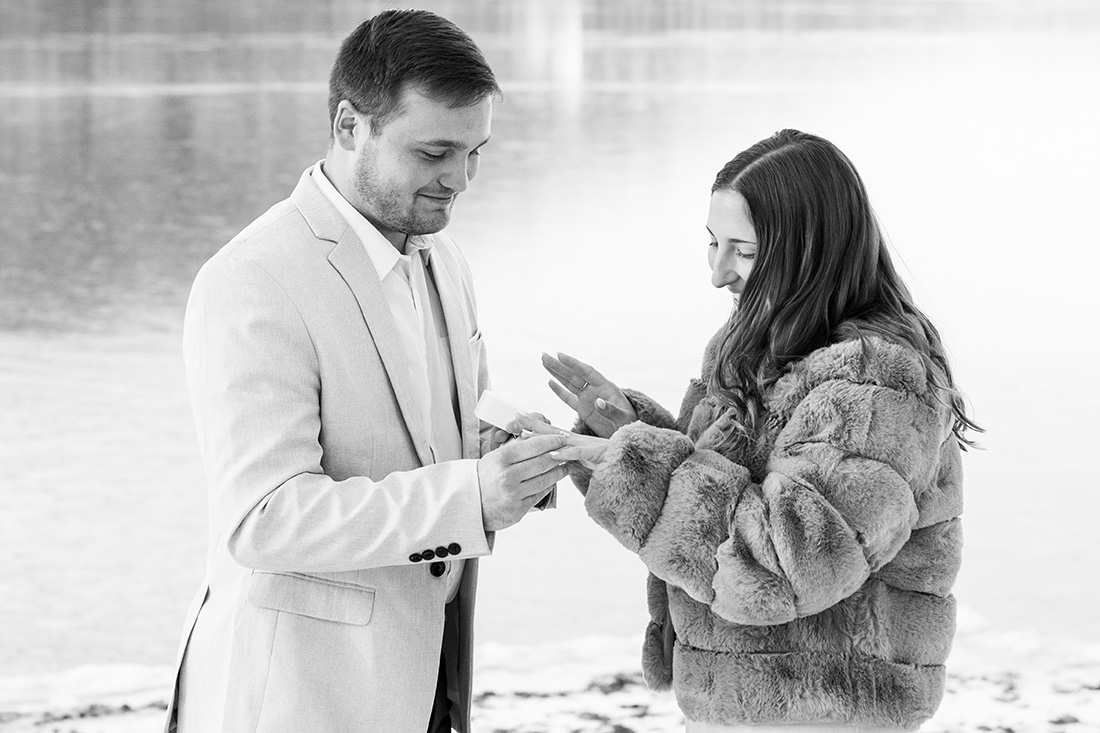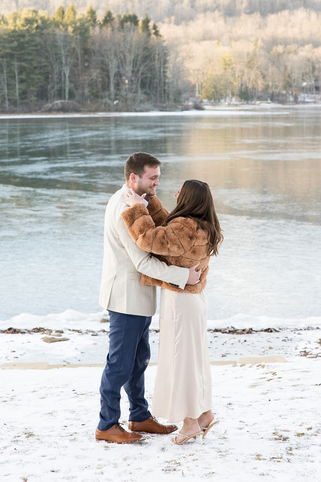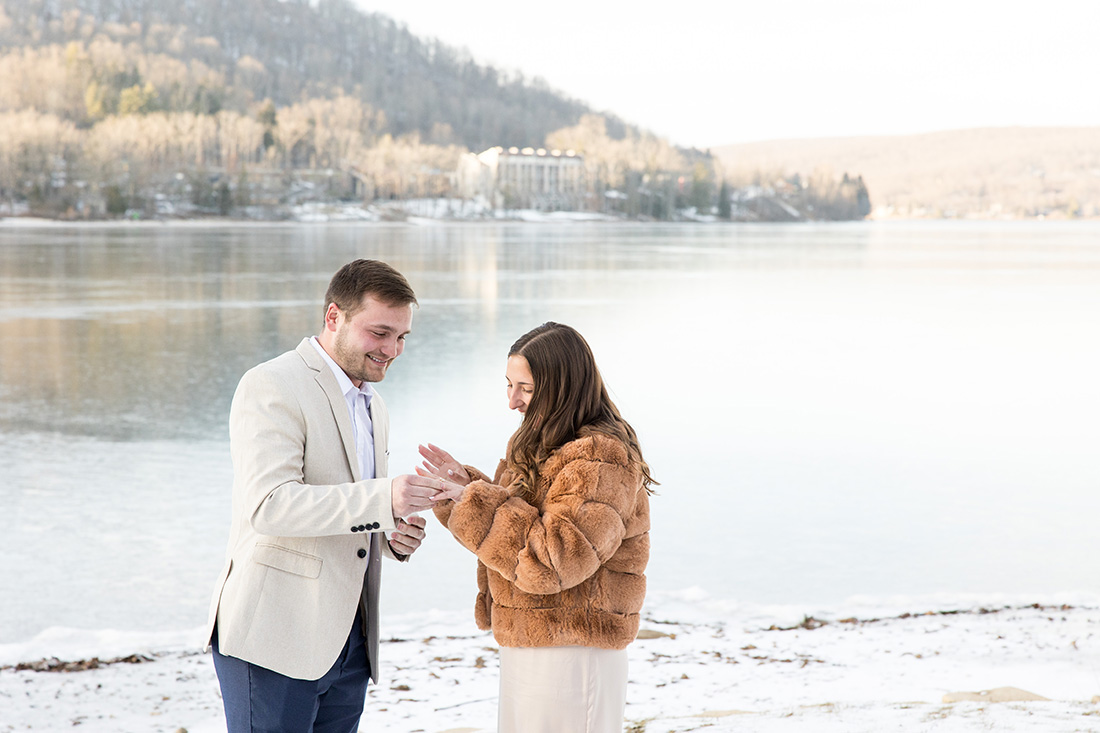 So much of what I remember from this proposal day involves the frosty conditions at the shoreline of Dutch’s at Silver Tree at Deep Creek Lake. The frozen lake, the frosted trees, a touch of snow on the ground, and the softest sunlight pouring across it all. The soft colors were just magnificent – golds and grays and blues and greens…